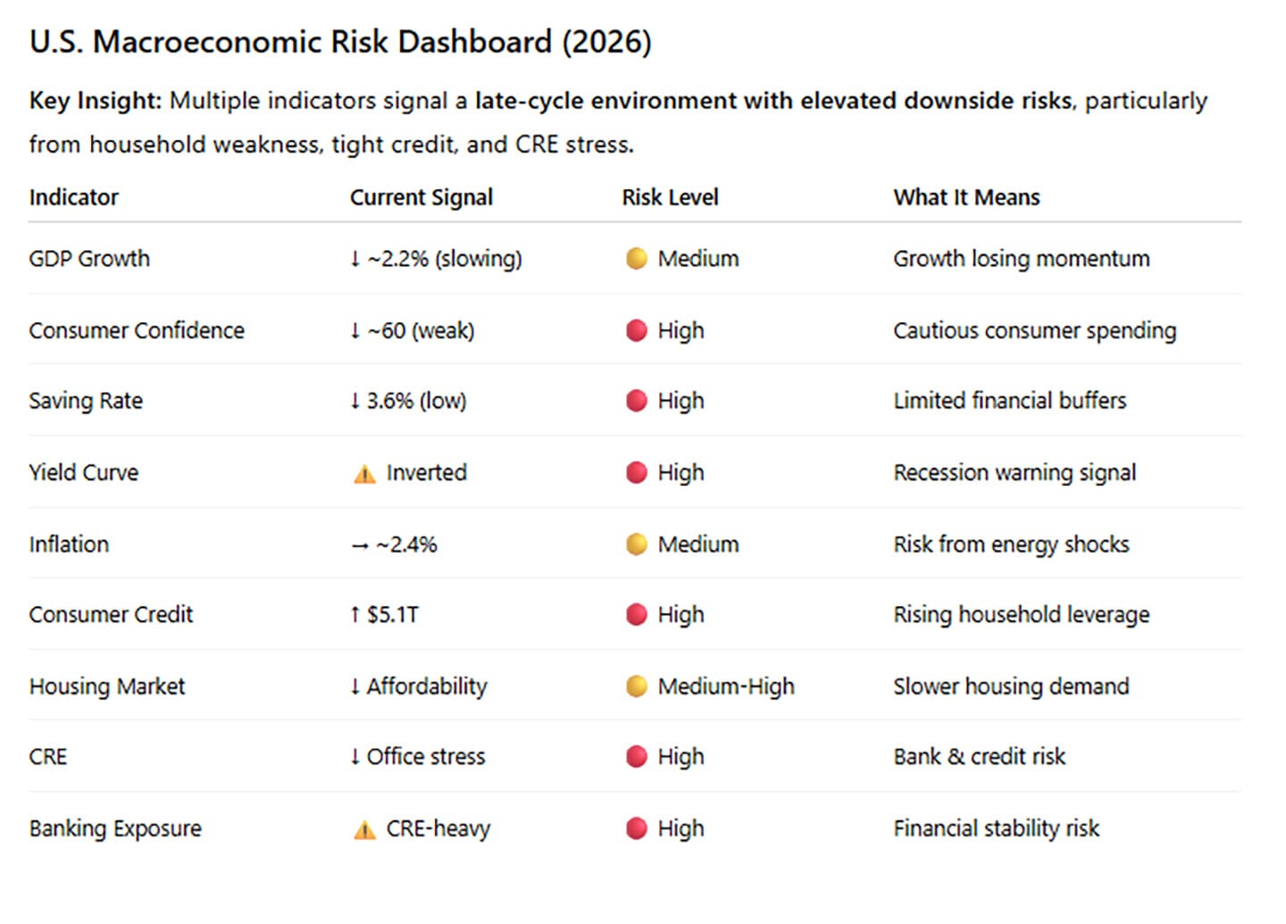 In summary, the U.S. economy remains on an expansionary path but is increasingly characterized by late-cycle fragility, with structural imbalances and tightening financial conditions elevating downside risks. The convergence of weakened household balance sheets, persistent yield curve inversion, commercial real estate stress, and constrained fiscal flexibility creates a more sensitive environment in which even modest shocks—particularly from geopolitics or energy markets—could have amplified effects. While a recession is not the base case, the margin for error has narrowed meaningfully. In this context, prudent portfolio construction, disciplined risk management, and a focus on quality and liquidity are essential, as investors navigate a transition from resilient growth toward a more uncertain and potentially volatile phase of the economic cycle.