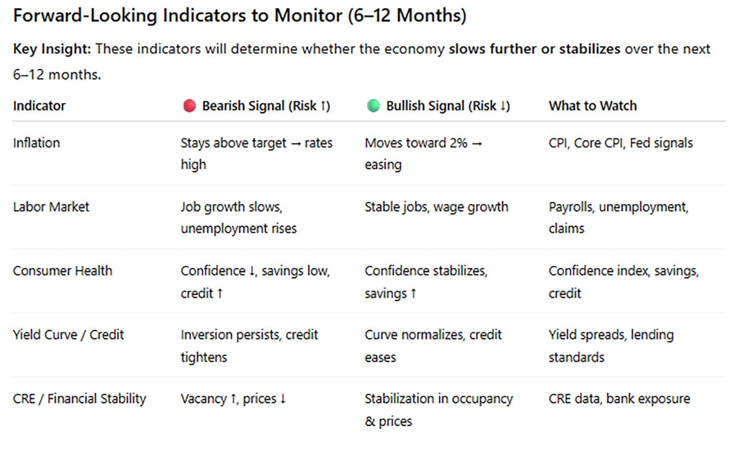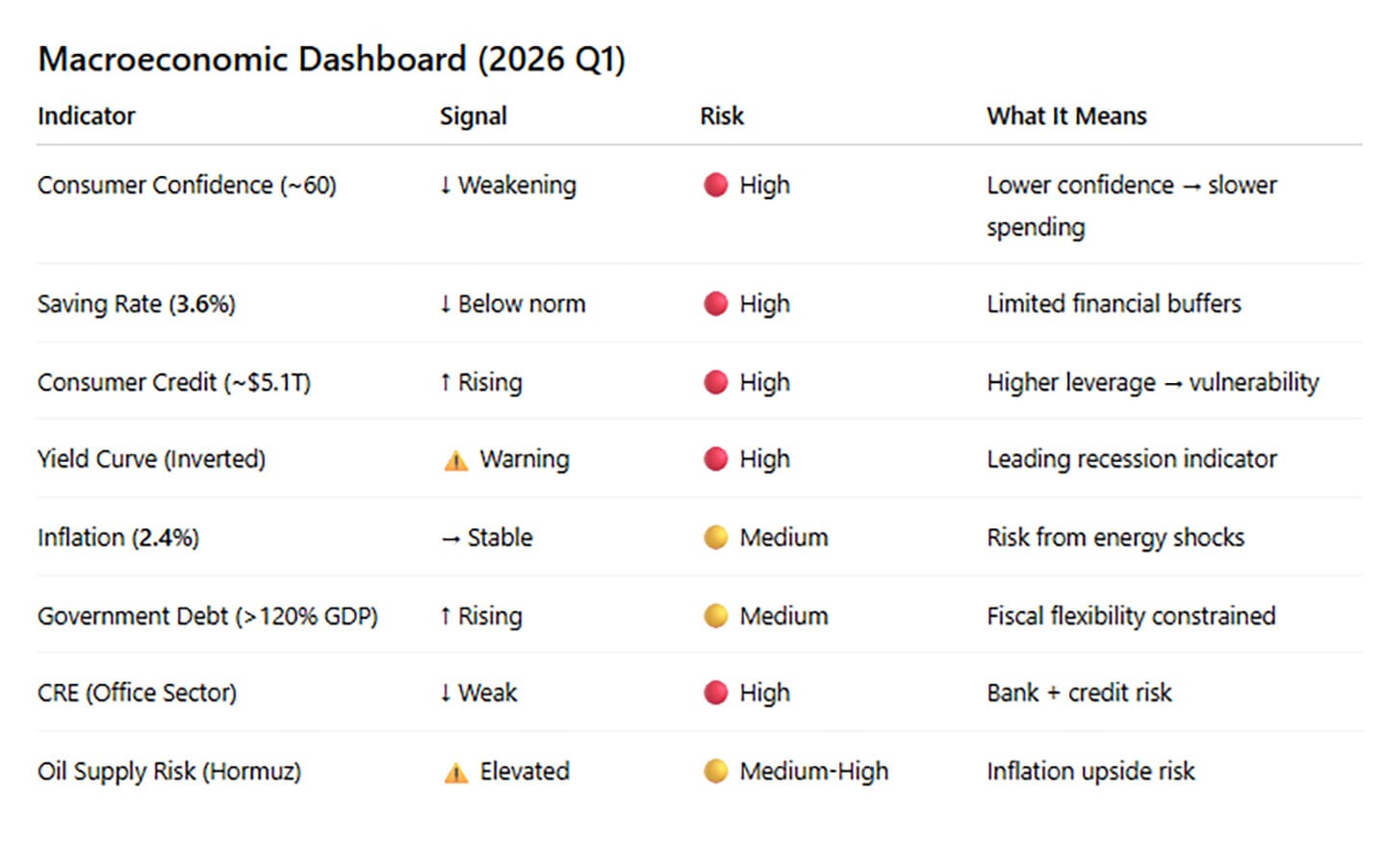 The U.S. economy remains in expansion but is entering a more vulnerable, late-cycle phase. Recent declines in household savings, persistent yield curve inversion, and rising CRE refinancing risks indicate a shift from stable expansion toward increased macroeconomic vulnerability. While growth continues, weakening household fundamentals, tight financial conditions, and elevated geopolitical risks increase the likelihood of slower growth over the next 6–18 months.