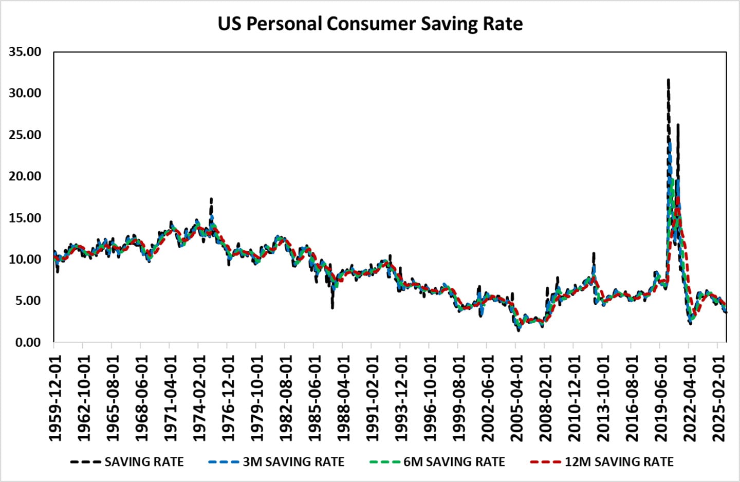 Personal Saving Rate: Approximately 3.6%, well below the historical 6–8% range, indicating limited financial buffers.