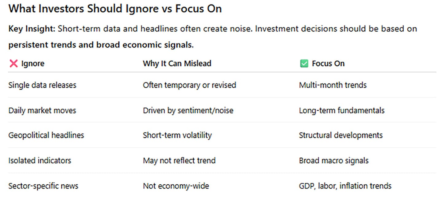 Investors should look through short-term volatility and focus on long-term trends in growth, labor, inflation, and financial stability to guide investment decisions.
