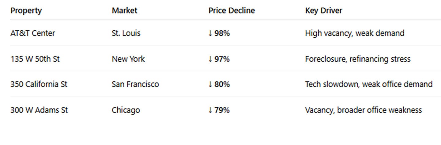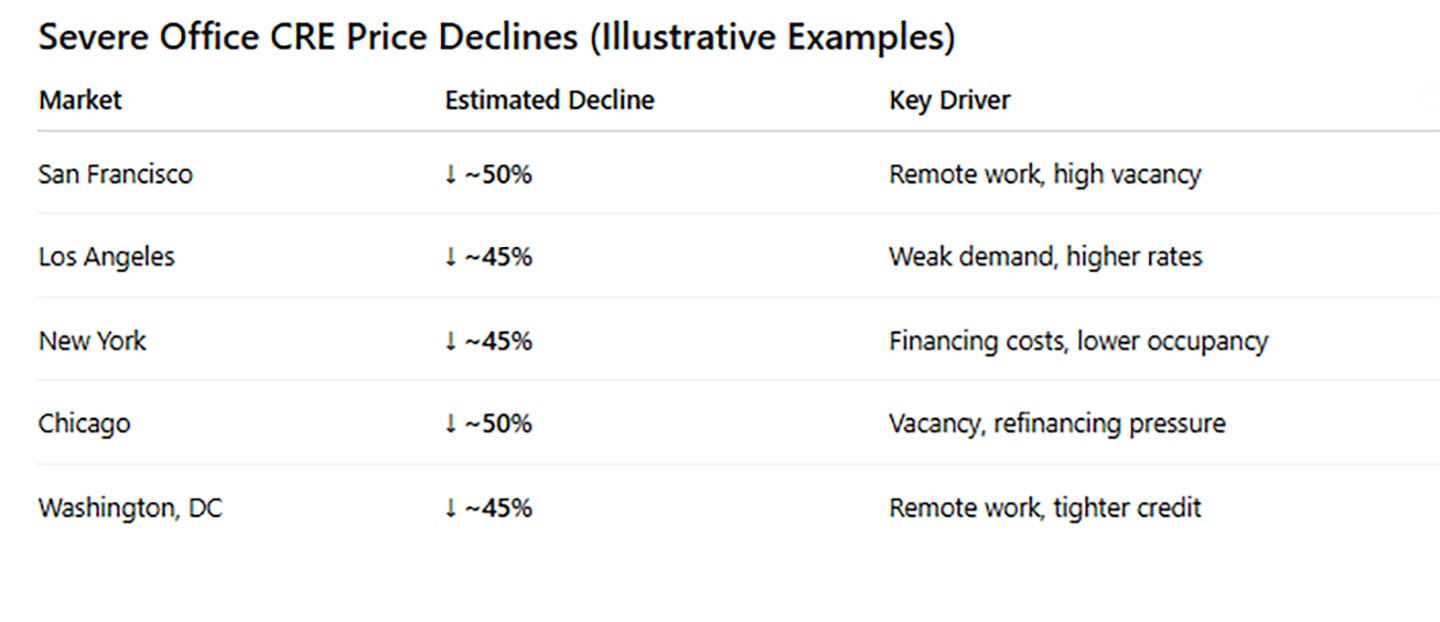 Office valuations have declined significantly (typically 20–50%), with more severe declines observed in distressed assets, reflecting remote work, higher rates, weak demand, and refinancing pressures. Given regional banks’ significant CRE exposure, further declines could elevate credit risk, tighten lending, and weigh on investment and growth.