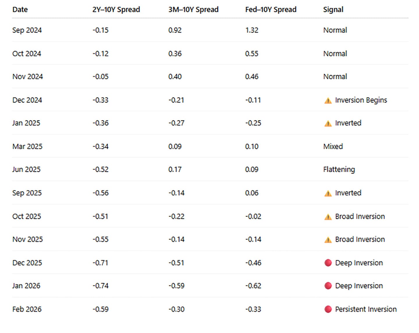 The U.S. Treasury yield curve has remained persistently inverted since October 2025. The yield curve reflects the difference between short-term and long-term U.S. Treasury interest rates and is widely used as a leading indicator of future economic conditions.