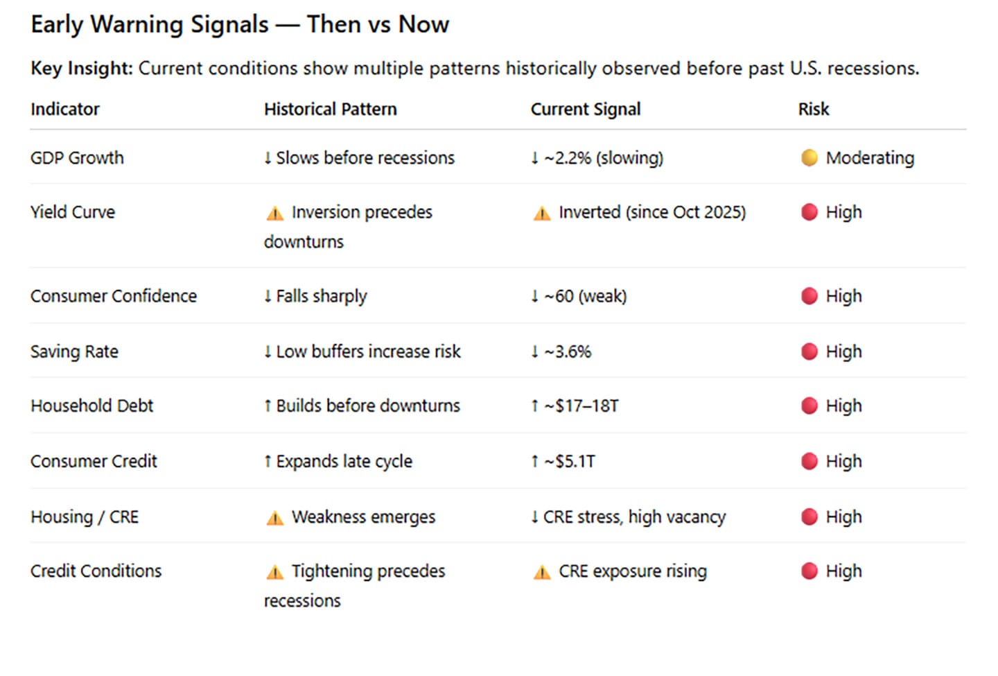 Taken together, these indicators suggest the U.S. economy is entering a more vulnerable phase, with slower growth and rising financial stress elevating recession risk amid tighter credit or external shocks.
