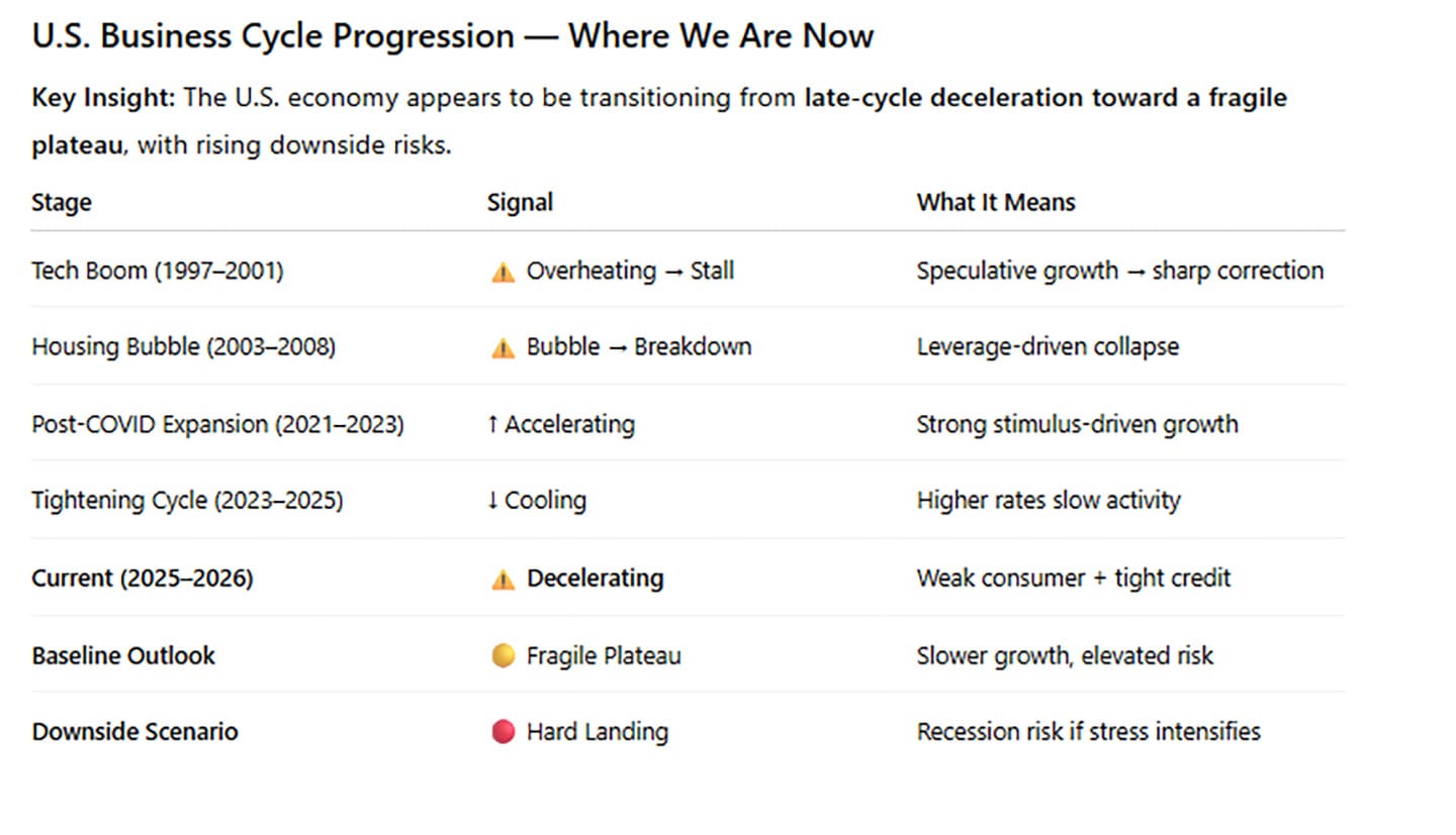 The U.S. economy remains in expansion but is entering a more fragile stage of the business cycle. While a recession is not imminent, weakening household fundamentals, tight financial conditions, and geopolitical risks increase the probability of slower growth.