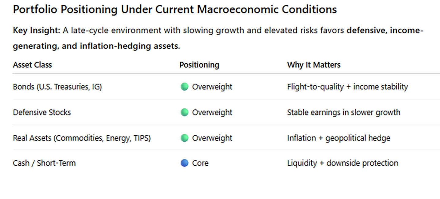 In a late-cycle environment characterized by moderating growth and elevated uncertainty, portfolio positioning should emphasize resilience and flexibility.