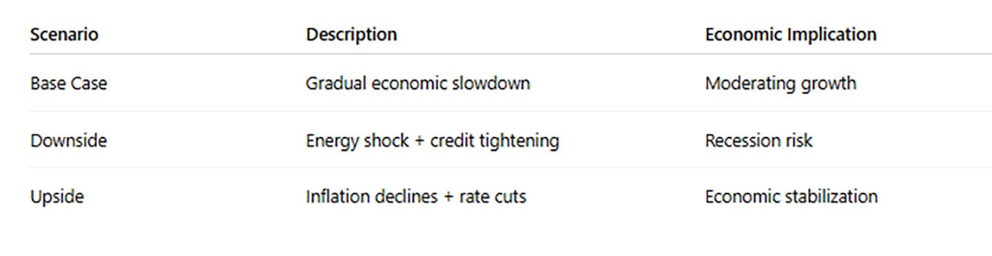 Scenario Analysis: The following scenarios outline potential economic outcomes over the next 6–12 months under varying paths for inflation, financial conditions, and geopolitical risks.